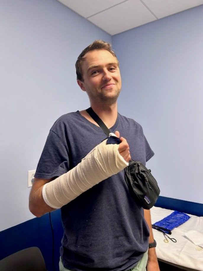Ned Fischer elected the creative writing curriculum for his summer at Oxford.  To his dismay, a month before he was to depart, he broke his right wrist which is his writing hand.  The first cast had his wrist immobilized, so he convinced the doctors into a better cast option that allowed some writing movement.