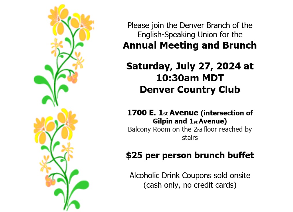 The meeting will include a review of the 2023-2024 Denver Branch program year, with reports from Branch Officers and Committee Chairs, and an election of new Branch Officers and Board Members.