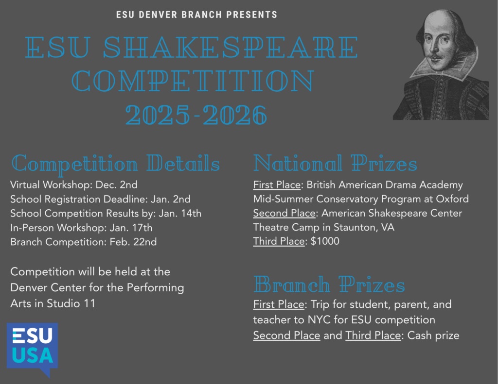 The ESU Denver Shakespeare Competition will be held in partnership with the Denver Center for the Performing Arts at the Robert & Judi Newman Center for Theatre Education, 1101 13th Street, Denver. The public is invited. Check in and proceed to Studio 11 on the third floor. Refreshments provided.