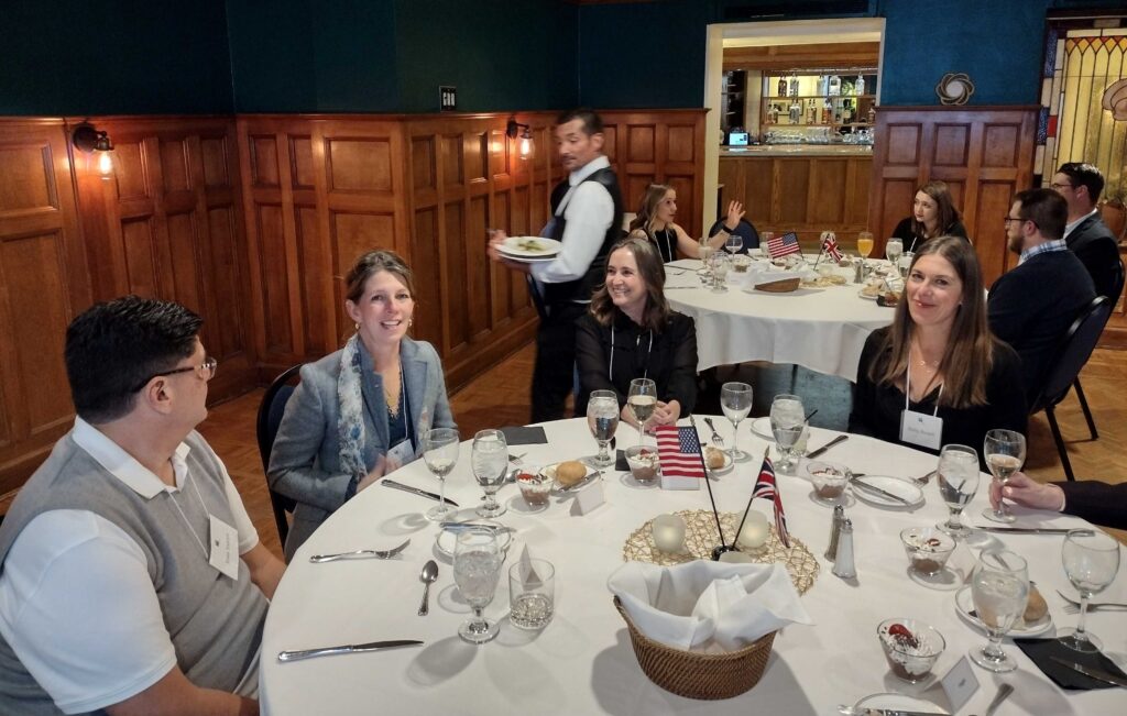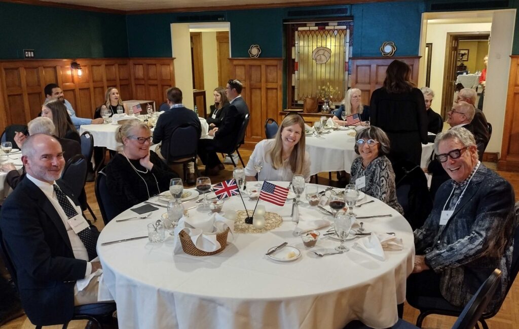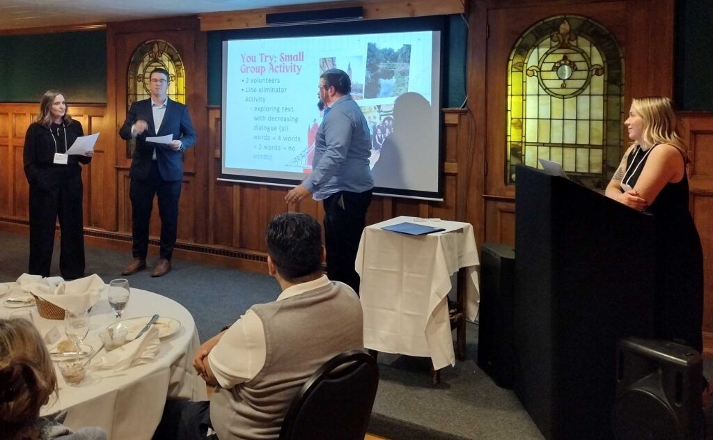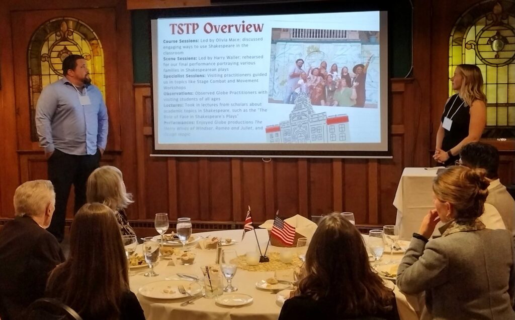The Denver Branch met at the University Club on November 13, 2025, to celebrate its 2025 TLab scholars. Manual High School teacher Ben Butler and Smoky Hill High School teacher Katie Cunninham both attended Teaching Shakespeare Through Performance at Shakespeare’s Globe in London. They co-presented a lively summary of their three-week study and its impact on their curriculum and in non-Shakespeare settings – with Ben’s football team and in Katie’s assignment of The Outsiders. Volunteers also participated in a small-group activity. It was a high-energy evening, enjoyed by all!