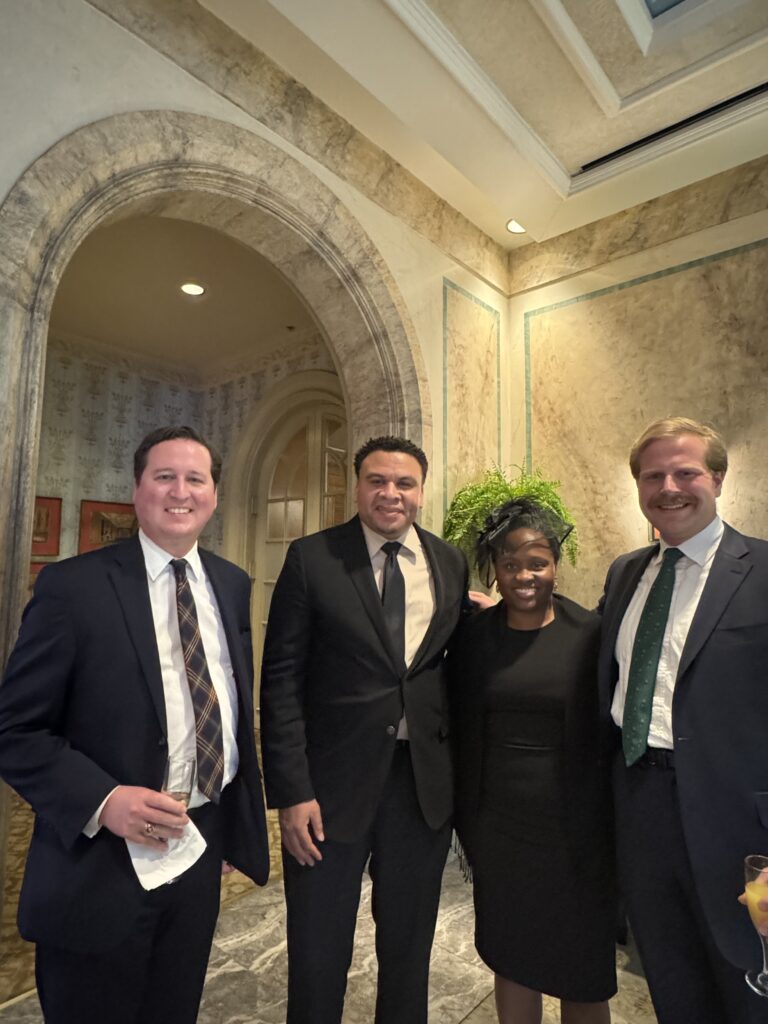 The lovely thrumming of harpist Luke Brechtelsbauer, decorations from the collection of Haydee Mackey’s family, a gracious tea with requisite amenities, and the reading of a special letter fused for the formal and festive fun of the English-Speaking Union, New Orleans Branch. As it has been for years, the ESU Christmas Tea took place in the Windsor Court Hotel. Branch president Bruce Gordon (with Melissa) read a letter from James Dawson, Head of Royal Correspondence of King Charles III and Queen Camilla (of Great Britain) that recalled the royal twosome’s visit to New Orleans on Nov. 4, 2005, shortly after Hurricane Katrina. The missive was a response to a thank-you letter sent by Gordon, on Aug. 29, 2025, concerning the historic visit and a reiteration of “the unbreakable bond between the peoples of the United Kingdom and the United States.” Yet another agenda item was the introduction of board members, including newly-dubbed Monique Clark of Thibodaux, who is working with the ESU National Shakespeare Competition Committee to be held on Sun., March 8, 2026, on the Tulane campus for Louisiana students. Two years ago, the national winner was Malachi White of the New Orleans Branch. Additional board members in attendance were Lenny Caruso, Dr. Rennie Culver, Benjamin Morrison, Haydee Mackey (with Kevin), Mimi Schlesinger, Preston Valois, and Benjamin Karp, author of the political thriller, “The Leviathan Conspiracy.” They shared tea talk with JP and Dr. Erin O’Sullivan Fleming, Dr. Julian Wheatley and wife Marjorie Nolan-Wheatley, Kathy Singleton, Julie and David Gooch, sisters-in-law Alexandra Stafford and Simone Rathle, and Katherine de Montluzin with Dallasites Jewel and Robert Williams. – Nell Nolan, Times Picayune – https://www.nola.com/entertainment_life/nell-nolan-sociedad-espanola-esu-christmas-tea-patio-planters-saint-lazarus-society/article_54ef88fb-7c0e-4812-94ae-a4723e6216f4.html